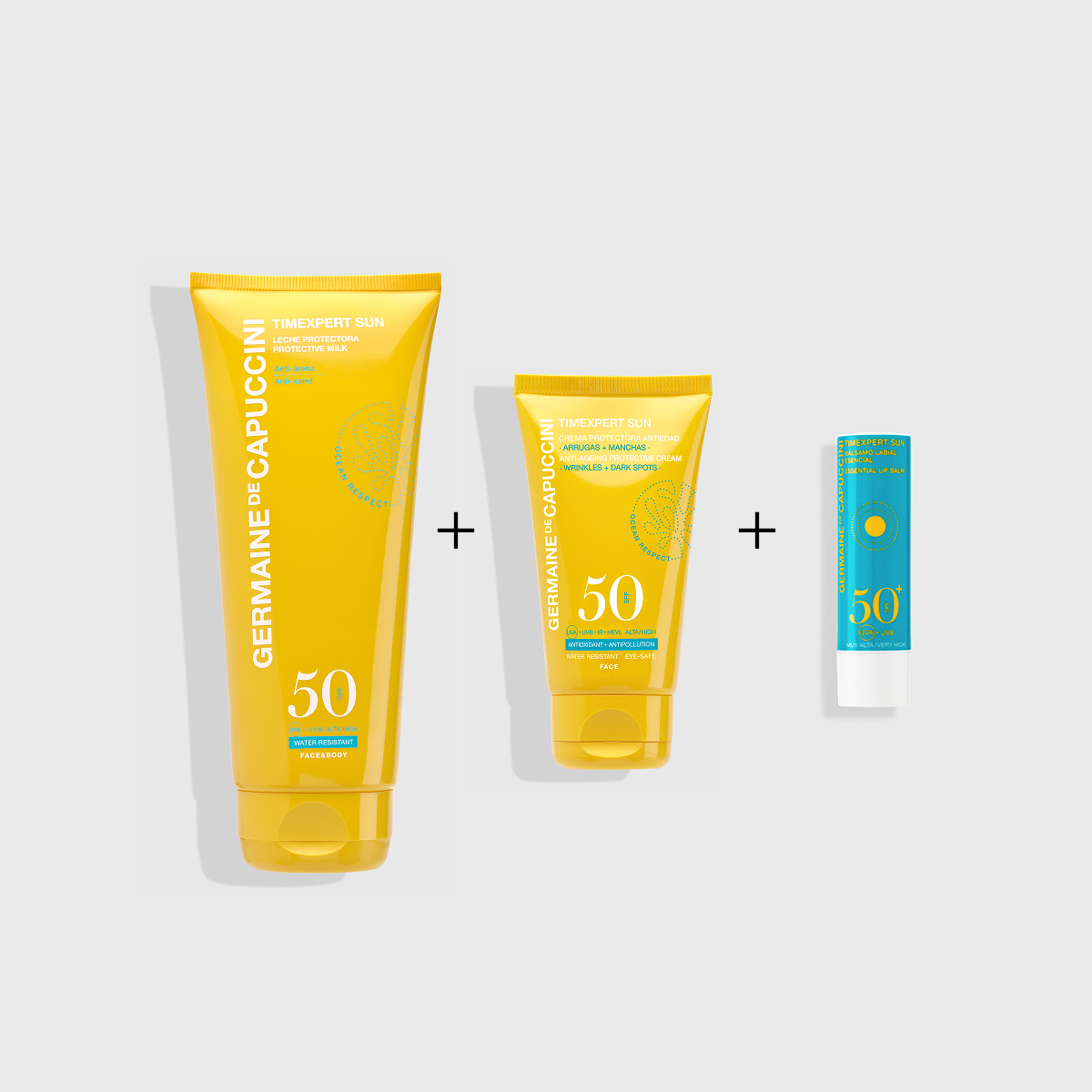 Inclusief een anti-aging gezichtscrème, een hydraterende lichaamsmelk die gemakkelijk aan te brengen is en een lippenbalsem met hoge bescherming, om aan alle behoeften tijdens blootstelling aan de zon te voldoen.