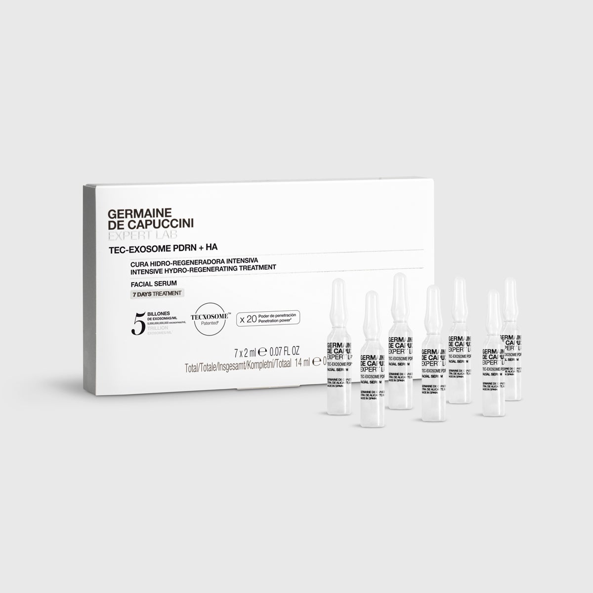TEC-EXOSOME PDRN+HA Cura Hidro-Regeneradora Intensiva tiene la alta precisión inspirada en la cosmética médico-estética. Una cura de choque de 7 días, ultra concentrada en exosomas biomiméticos vegetales, PDRN y ácido hialurónico multicapa para ayudar a transformar la piel desde el interior.