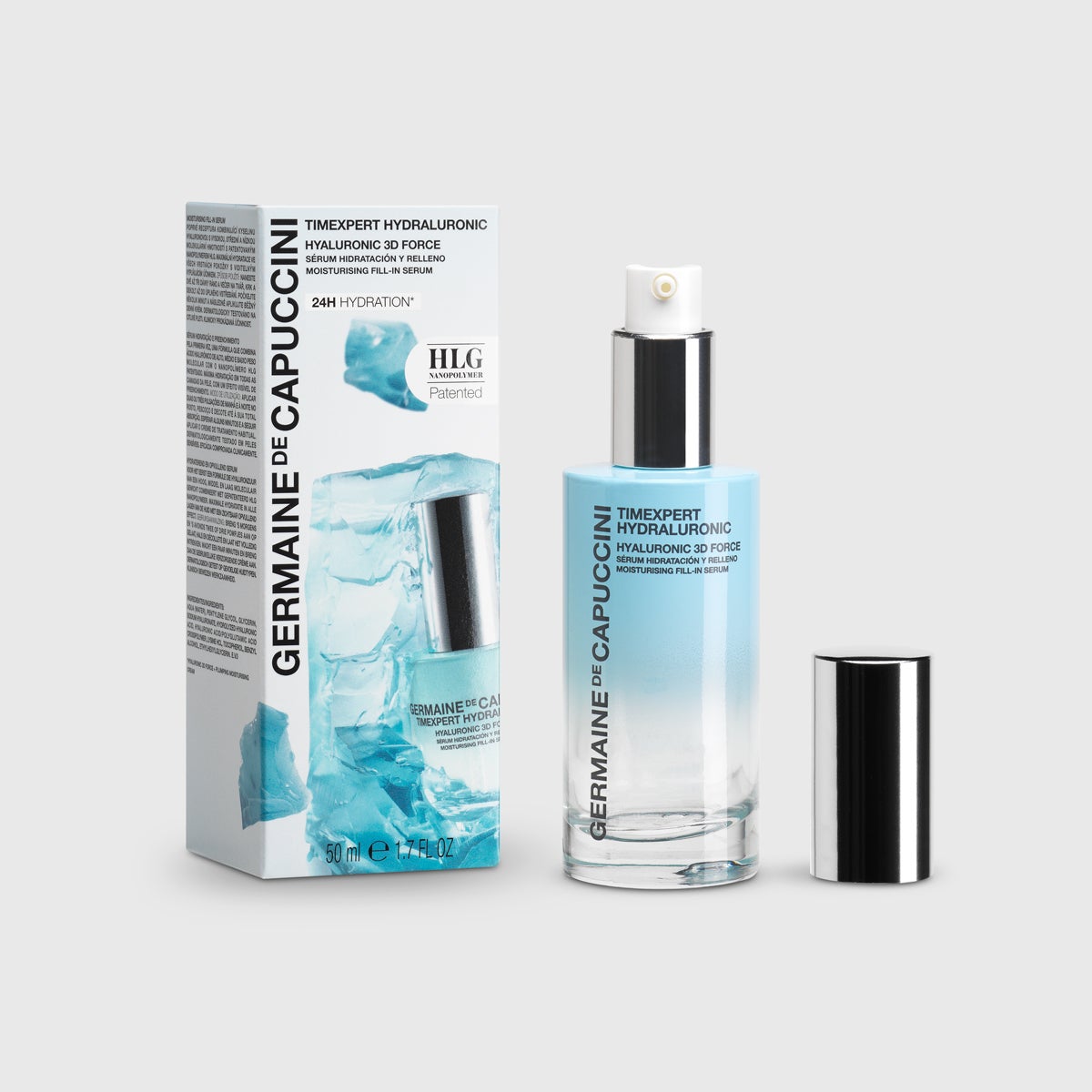 Su fórmula combina Ácido Hialurónico de alto, medio y bajo peso molecular con el nanopolímero HLG patentado para optimizar la captación y retención de agua durante 24 horas.