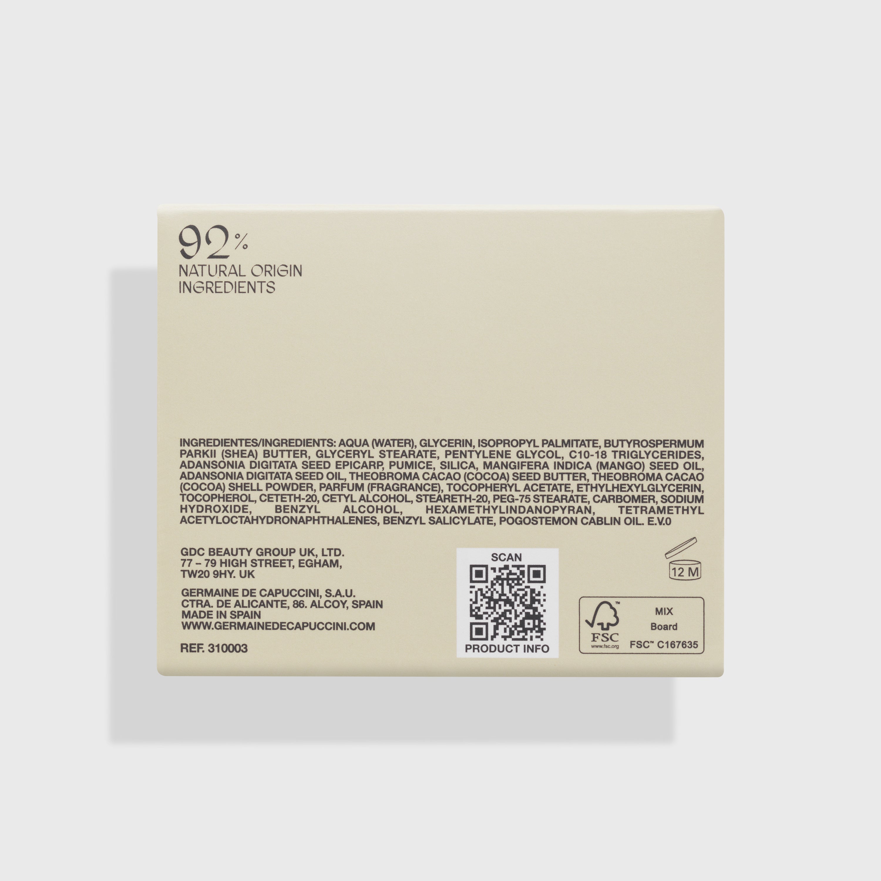 Sumérgete en la calma de nuestro viaje African Safari con esta manteca de textura fundente que combina la acción enzimática y mecánica de Partículas de Cacao, Baobab y Piedra Pómez para eliminar células muertas sin irritar.