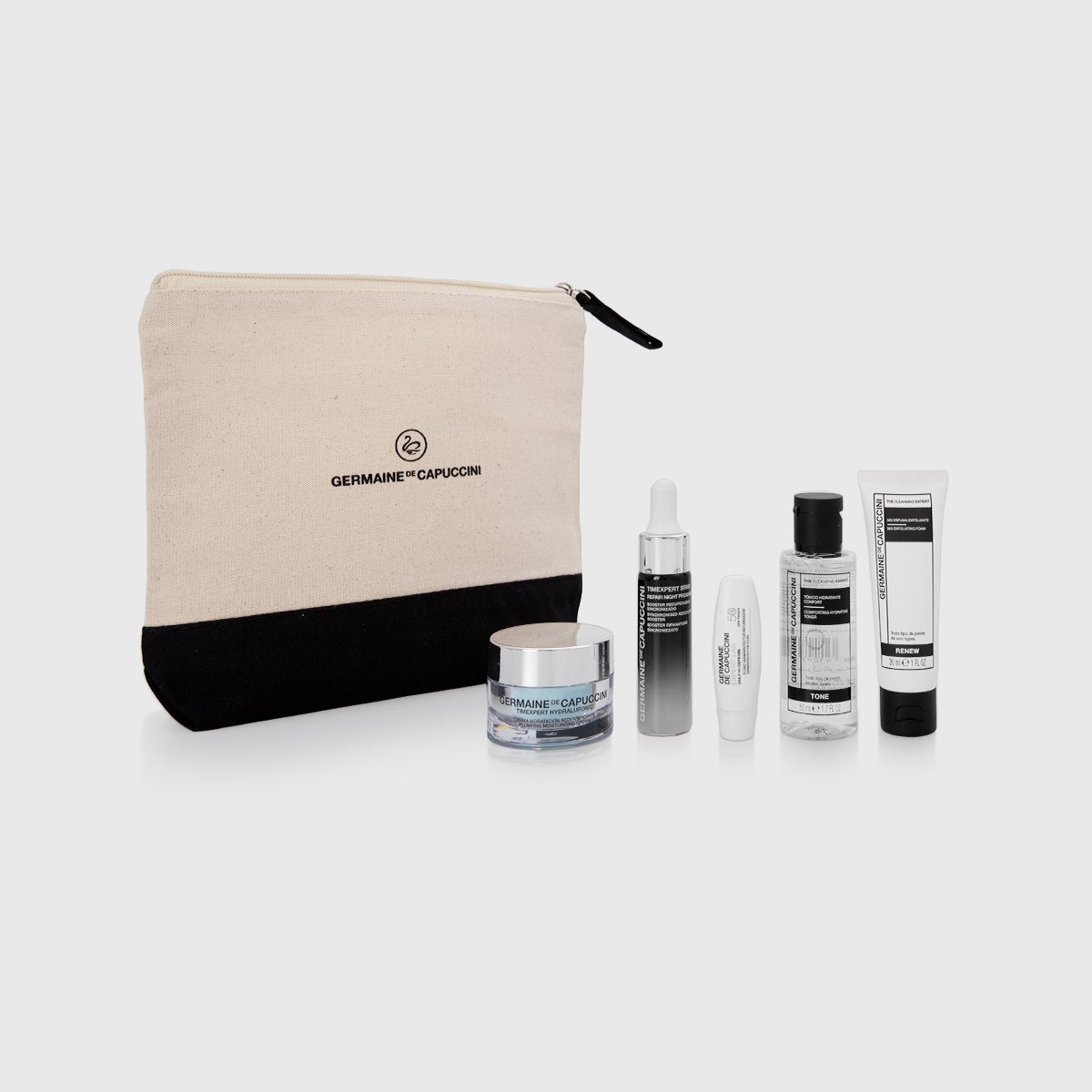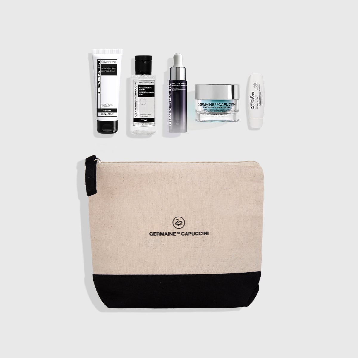 Neceser de tallas deluxe con cinco best-sellers de Germaine de Capuccini para completar tu rutina facial: limpieza, hidratación redensificante, reparación intensa y protección diaria SPF50. Ideal para descubrir texturas, regalar o llevar de viaje.