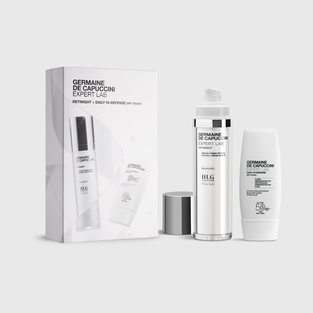 De noche, Retinight rejuvenece la piel, reduciendo arrugas y mejorando la firmeza. De día, Daily Hi-Defense SPF50 protege, matifica y defiende contra el daño ambiental, manteniendo tu piel saludable las 24 horas.