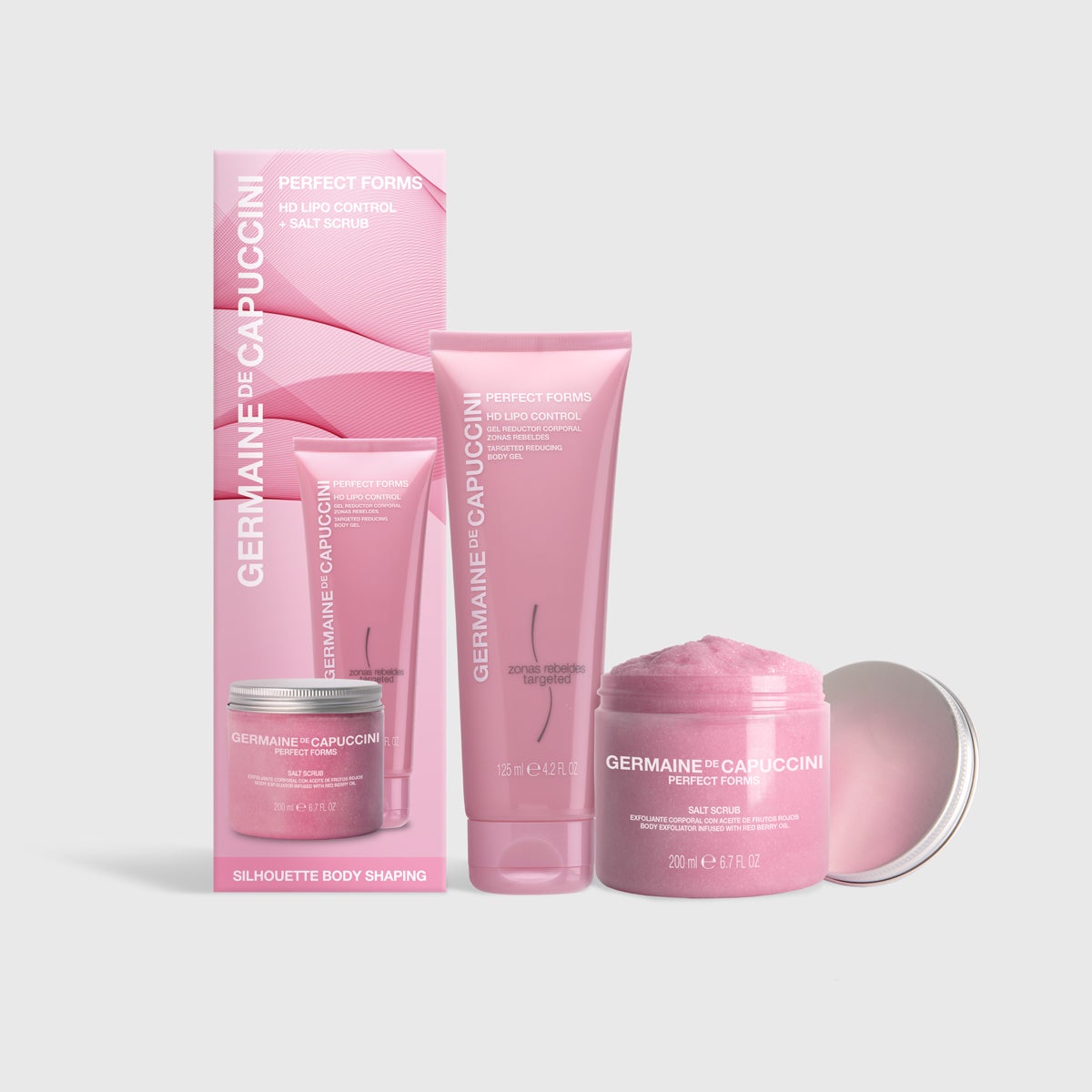 Esfoliazione e riduzione in un solo gesto: pelle rinnovata e più soda con il pacchetto di Salt Scrub e HD Lipo Control.