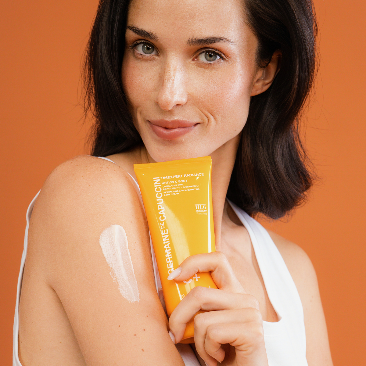 Illuminating body cream with Vitamin C and HLG nanopolymer.