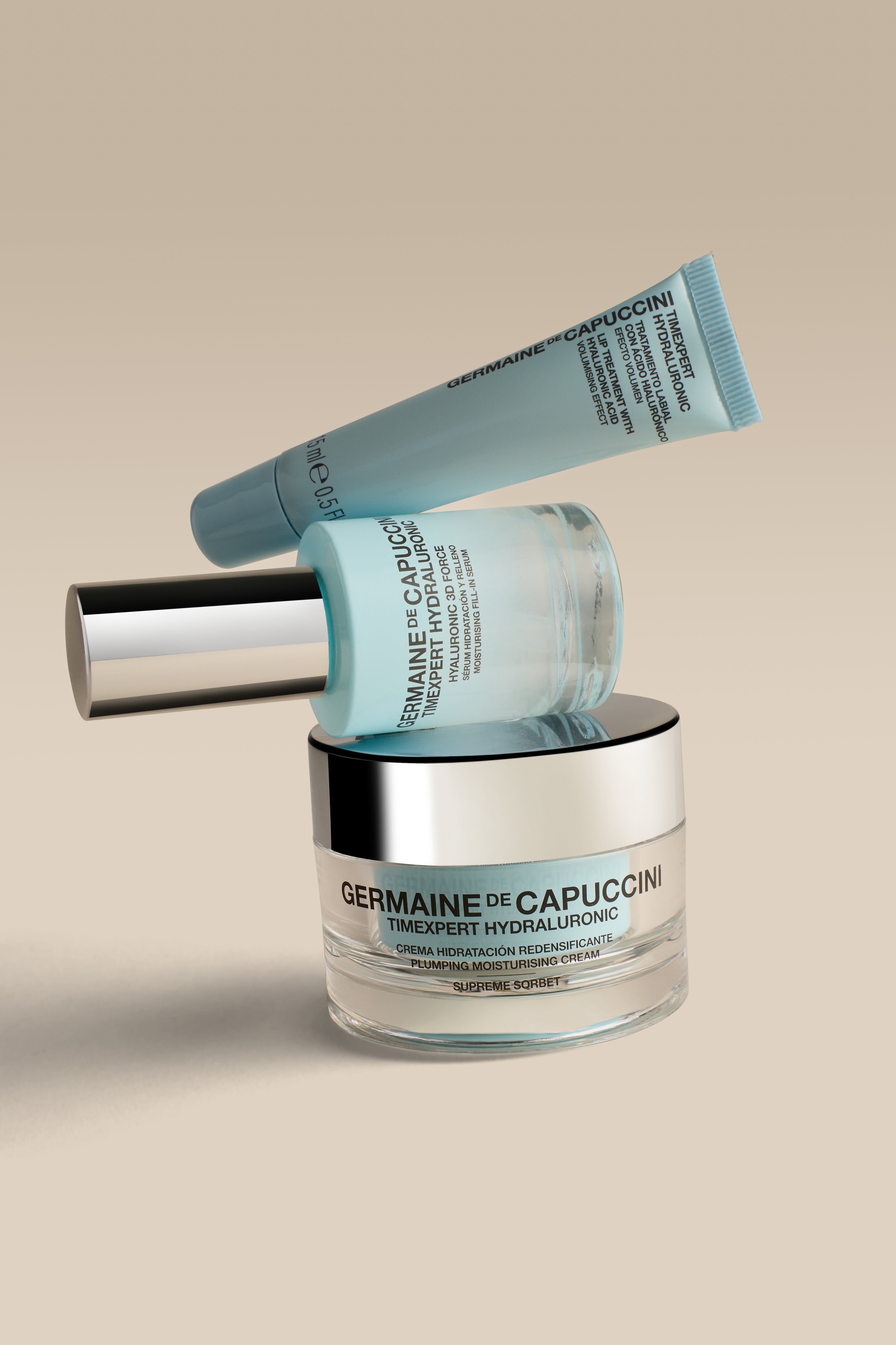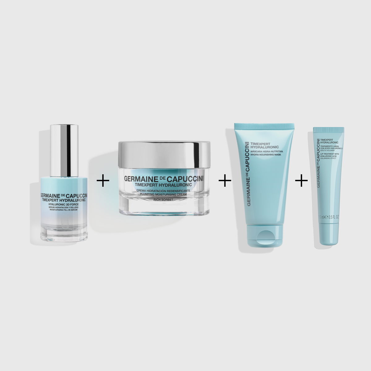Complete intensive hydration routine with visible plumping effect: serum, mask, lip treatment, and cream of your choice. More dewy, elastic, and redensified skin from the first application.